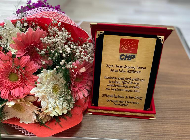 Uzman Sosyolog Terapist Kürşat Şahin Yıldırımer bu anlamda çalışması nedeniyle, CHP Bayraklı İlçe Başkanı Av. Pınar Susmuş ve CHP Bayraklı Kadın Kolları Başkanı Suna Karabağ tarafından plaketle ödüllendirildi.