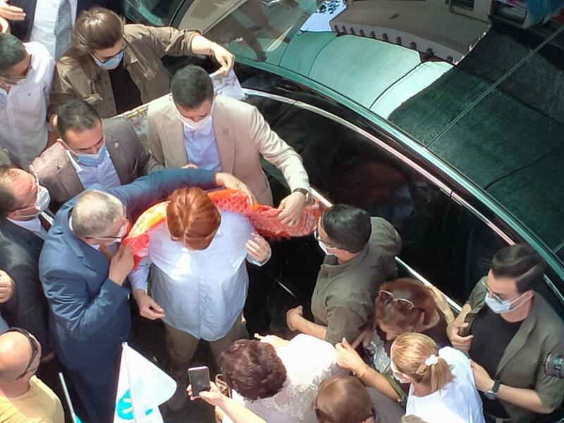 Davul-zurna ile karşılanan Genel Başkan Akşener’e, Milas İlçe Başkanı Kasım Özkan, üzerinde genel başkanın ismi yazılı Yağlık (Yörük kıyafetinin bir parçası) ve çiçek takdim ederken, toplanan kalabalık sık sık Genel Başkan Akşener lehine sloganlar attı.