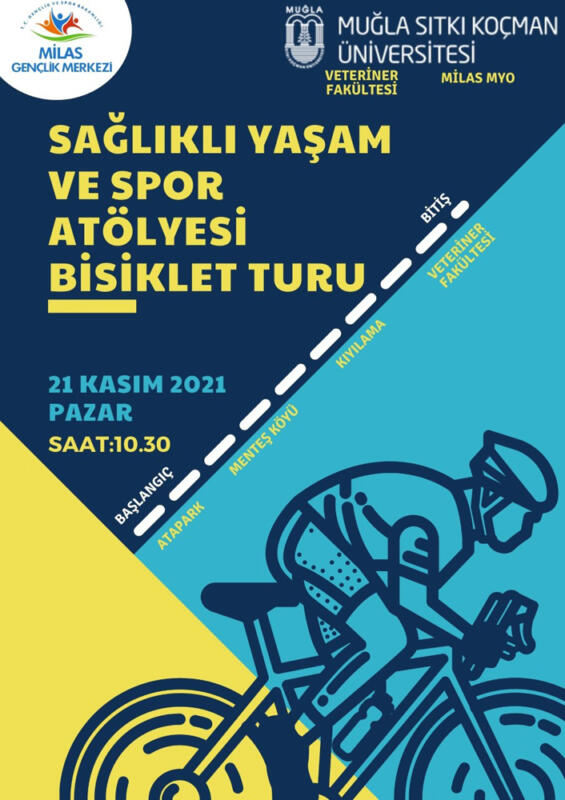 Milas Gençlik Merkezi Müdürlüğü koordinesinde, Milas Veteriner Fakültesi, Milas Meslek Yüksek Okulu ve İlçe Milli Eğitim Müdürlüğü ile ortaklaşa olarak, “Sağlıklı Yaşam ve Spor Atölyesi Bisiklet Turu” Milas’ta 21 Kasım 2021 Pazar günü saat 10.30’da düzenlenecek.