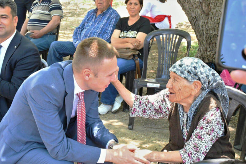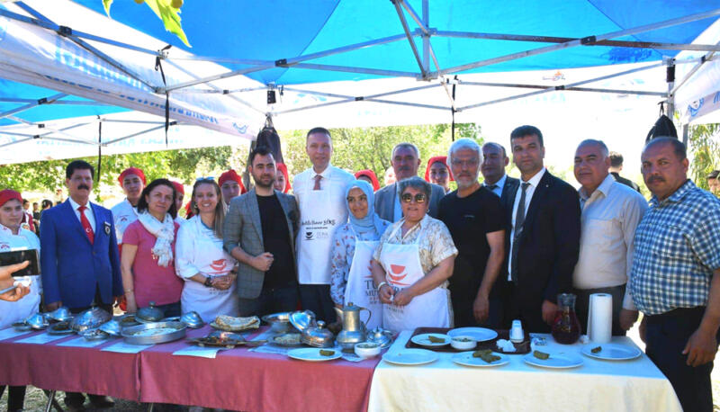 Yöresel lezzetleri inceleyen ve yapılışı hakkında bilgiler alan Milas Kaymakamı Mustafa Ünver Böke ve protokol üyeleri Pembe Teyze eşliğinde birlikte sarma sardılar.