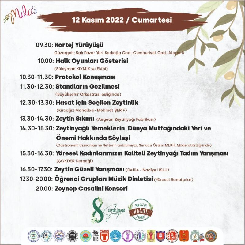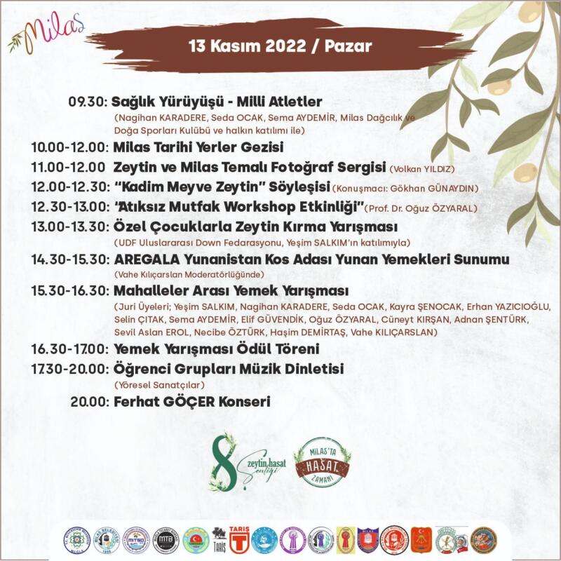 Milas Belediyesi Basın Bürosundan verilen bilgiye göre, Salı Pazarı’ndan Kortej yürüyüşü ile başlayacak program, iki gün boyunca farklı etkinliklerle Milas halkına keyifli dakikalar yaşatacak. Söyleşiler, yarışmalar, müzik dinletileri ile renklenecek 8. Milas Zeytin Hasat Şenliği’nin detaylı programı şöyle: