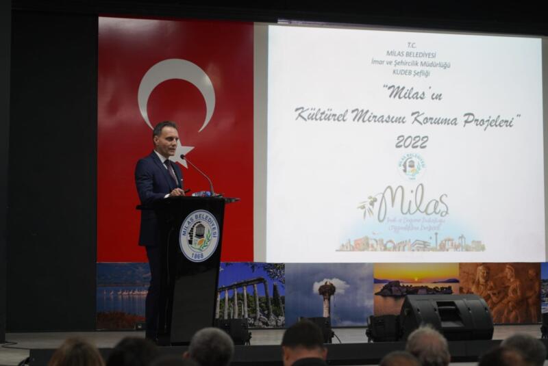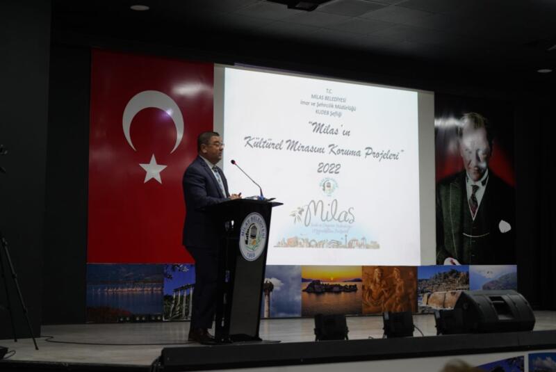 Milas’ın tanıtım videosundan sonra İmar ve Şehircilik Müdürlüğü KUDEB Şefliği Birim Sorumlusu Arkeolog İsmail Ernur Öztekin, Milas’ın Kültürel Mirasını Koruma Projeleri’nin sunumunu gerçekleştirdi.