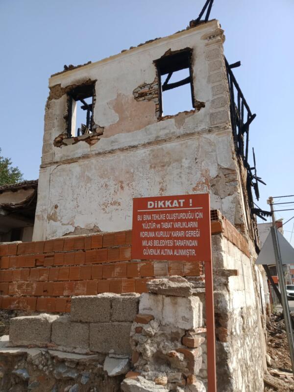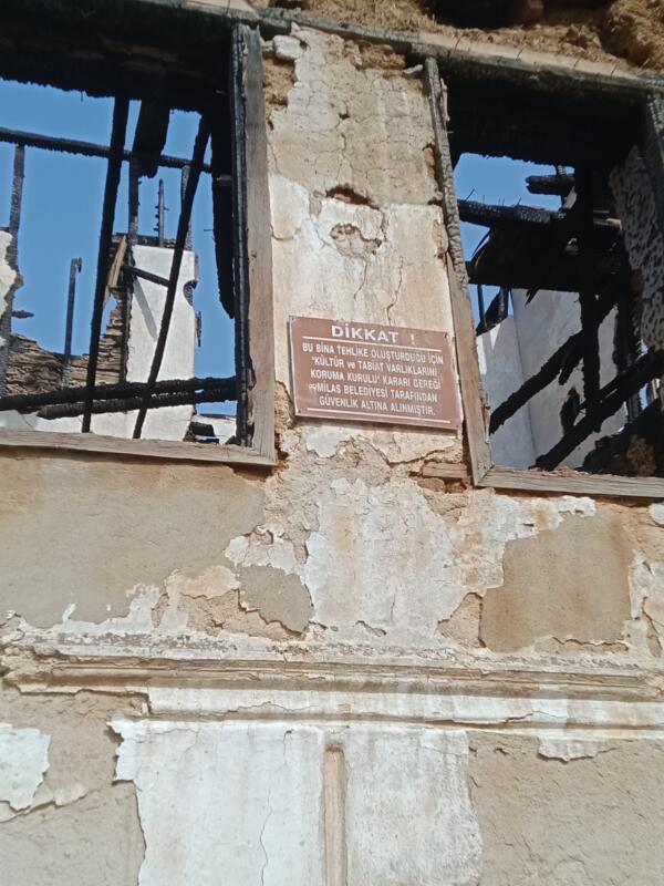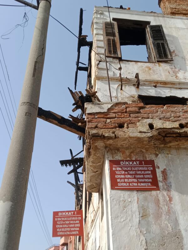 Tehlike oluşturduğu için ‘Kültür ve Tabiat Varlıklarını Koruma Kurulu’ kararıyla Milas Belediyesi tarafından güvenlik altına alınan bu bina, yandıktan sonra çok daha büyük bir ‘tehlike oluşturuyor’, dolayısıyla, yanmadan önce alınan önlemlere ek olarak, daha etkili önlemler alınması gerekiyor ama yangından iki gün sonra görüntülemeye gittiğimizde gördük ki, uyarı tabelalarının sayısının arttırılmasının dışında herhangi bir özel, ek çalışma yapılmamış …