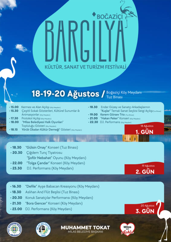 Ulusal öneme haiz olan sulak alan olarak tescillenen ve her yıl binlerce flamingonun barındığı Tuzla Sulak Alanı’na ev sahipliği yapan Milas’ın Boğaziçi Mahallesi’nde Bargilya Kültür, Sanat ve Turizm Festivali gerçekleştirilecek. 18 Ağustos’ta başlayacak olan festivalde, birbirinden özel sokak gösterileri, animasyonlar, halk oyunları gösterileri, sergiler, DJ performansları, tiyatro gösterileri ile defileler düzenlenecek. Bargilya Festivali’nde Kerem Görsev, Hakan Peker, Gülsin Onay, Tolga Çandar, Bora Gencer, Aslıhan And Flüt Beşlisi de sahne alacak.