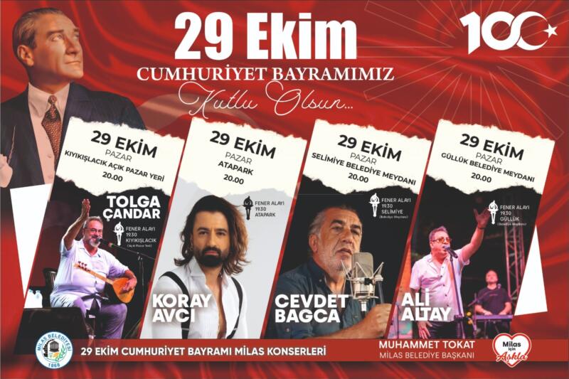 29 Ekim Pazar günü, Milas Atapark, Kıyıkışlacık, Güllük ve Selimiye’de gerçekleşecek etkinlik programı kapsamında saatler 19.30’u gösterdiğinde sokaklar fener alaylarıyla aydınlanacak olup saat 20.30’da ise eş zamanlı olarak dört noktada konserler düzenlenecek.