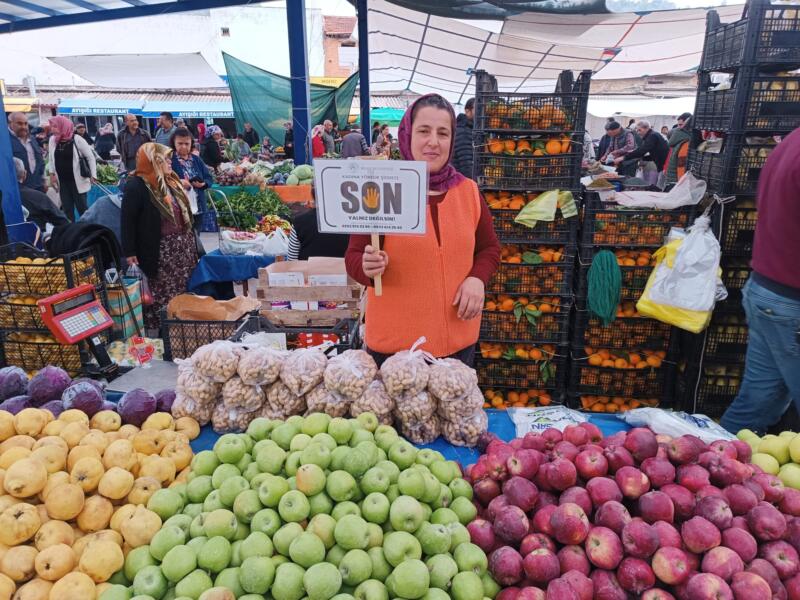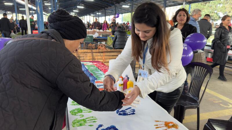 Kadına yönelik şiddetle mücadelede toplumsal farkındalık oluşturmak için pazar esnafına mor balonlar ve pankartlar dağıtan ekipler, parmak boyaları ile kadınların el baskısını alarak “Kadına Şiddete Son” mesajına vurgu yaptı.