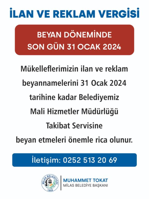 İlan Reklam Vergisi’nde beyanda bulunmak isteyen mükellefler 31 Ocak 2024’e kadar Milas Belediyesi Mali Hizmetler Müdürlüğü Takibat Servisi’ne başvuru yapabilecek.