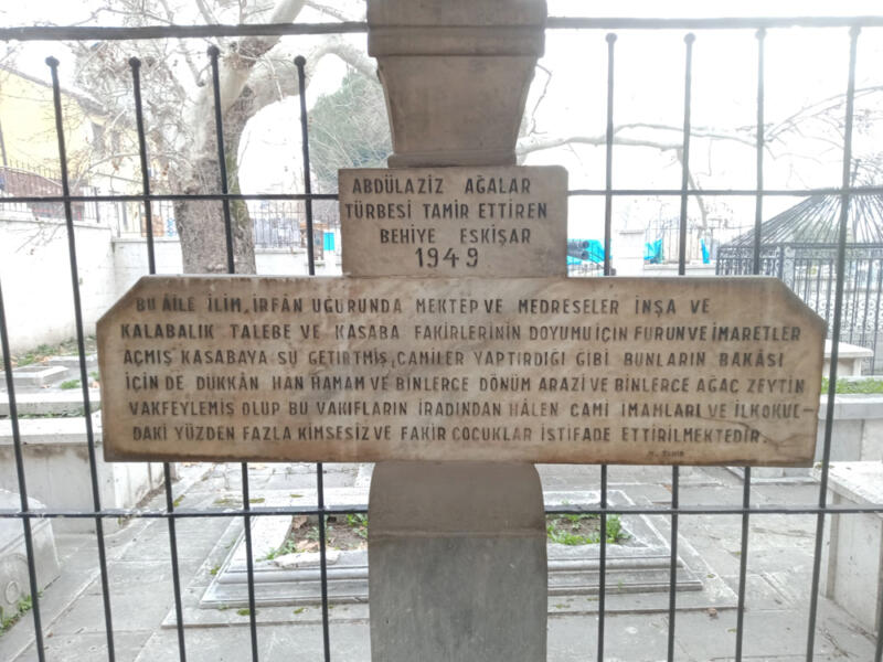 Kabristanın, Mehmet Sait Bey’in Kızı ve Eskihisarlı Murat Bey’in Eşi olan Behiye Eskişar (1880 – 1951) tarafından 1949 yılında bakım onarımının yaptırıldığına ilişkin ve N.Tahir adlı usta tarafından yapılmış kitabesinde, Abdülaziz Ağa sülalesine ilişkin şu bilgiler verilmektedir: