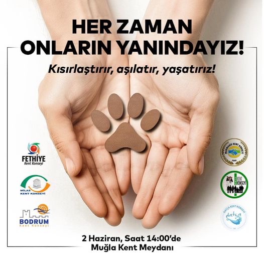 Bodrum, Datça, Fethiye, Marmaris, Menteşe ve Milas Kent Konseylerinin 2 Haziran Pazar günü saat 14’te Muğla kent meydanında sokak hayvanları ile ilgili ortak bir açıklama yapacağı bildirildi.