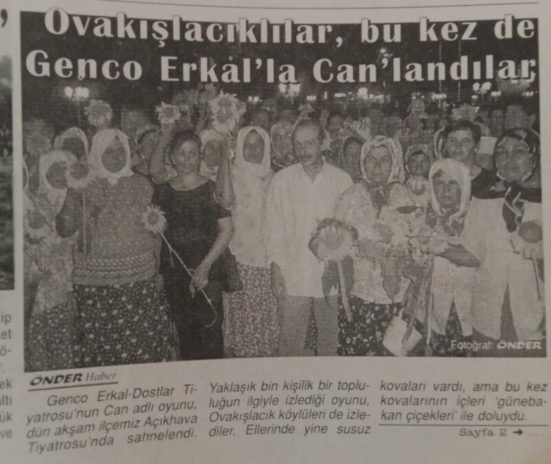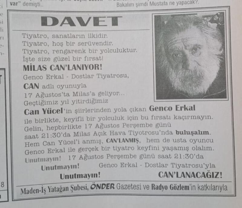 Can Baba (Yücel), 12 Ağustos 1999 tarihinde ayrılmıştı aramızdan. Bir yıl sonra Datça Belediyesi tarafından 18 Ağustos 2000’de düzenlenen anma etkinliğine katılacak olan Genco Erkal’ı bir gün öncesinde Türkiye Maden-İş Sendikası Yatağan Şubesi, Milas ÖNDER Gazetesi ve Milas Radyo Gözlem’in katkılarıyla Milas’ta konuk etmiştik. 17 Ağustos Perşembe akşamı, Milas Açık Hava Tiyatrosu’nda “CAN” adlı tek kişilik oyununu sahnelemişti Genco Erkal. Milas için, Milaslılar için, özellikle de Ovakışlacıklılar için unutulmaz bir buluşmaydı.