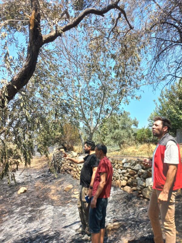 İl Müdürü Saylak, yaklaşık 7 saat boyunca devam eden yangında ilk belirlemelere göre; 350 nüfuslu Çakıralanmahallesinde yaklaşık 55 dekar zeytinlik ve meyve alanından oluşan 12 parselde hasar görüldüğünü kaydetti. Saylak, Sekköy Mahallesi’nde ise yine zeytinlik ve meyve alanından oluşan toplam 6 dekar büyüklüğünde 23 parselin yangından etkilendiğini açıkladı. Yangının ilk dakikalarından itibaren İlçe Müdürlüğü ekiplerinin sahaya indiğini belirten Saylak, “Ekiplerimiz, sabahın ilk ışıklarına kadar yangın bölgesindeki üreticilerimizin yanındaydı. Hayvanların güvenli bölgeye tahliyesini sorunsuz bir şekilde gerçekleştirdik. Söndürme ekiplerine destek verdik. Şimdi de teknik ekibimiz bölgede hasar tespit çalışmalarına başladı.” dedi.