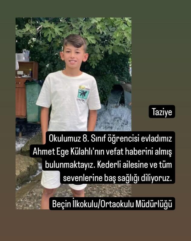 Milas’ın Beçin Ortaokulu öğrencisi Ahmet Ege Külahlı’nın vefat haberi, ailesini, arkadaşlarını ve tüm Milas halkını derin üzüntüye boğdu. Aslen Kayadere Köyü’nden olan Ahmet Ege Külahlı, Beçin Mahallesi Kıylama Mevkii’nde ikamet ediyordu.
