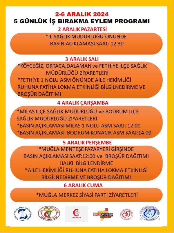 İş bırakma eyleminin dördüncü günü saat 12’de Menteşe pazaryeri girişinde basın açıklaması ve “Aile Hekimliği Ruhuna Fatiha Lokma Etkinliği” ve broşür dağıtımı ile yurttaşlar bilgilendirilecek.
