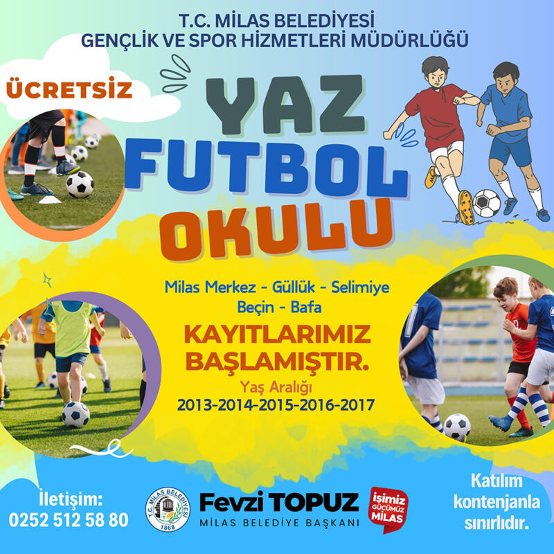Milas Belediyesi, çocukların yaz tatilini sporla değerlendirmesi ve futbola yönlendirilmesi amacıyla her yıl olduğu gibi bu yıl da Yaz Futbol Okulu’nun kapılarını açıyor.