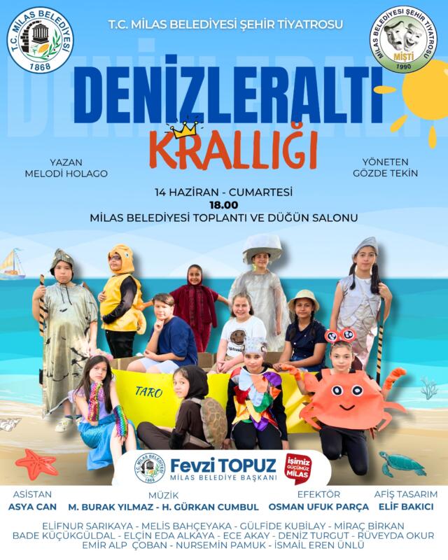 Geleceğin yetenekli tiyatrocuları tarafından sahnelenecek ilk oyun, 14 Haziran Cumartesi günü saat 18.00’de Milas Belediyesi Toplantı ve Düğün Salonu’nda izleyiciyle buluşacak. Melodi Holago’nun kaleminden çıkan ve Gözde Tekin’in yönettiği “Denizleraltı Krallığı” adlı eser, zengin oyuncu kadrosuyla dikkat çekiyor. Elifnur Sarıkaya, Melis Bahçeyaka, Gülfide Kubilay, Miraç Birkan ve Bade Küçükgüldal gibi isimlerin yanı sıra birçok genç oyuncunun rol aldığı oyun, izleyenleri su altı dünyasının büyülü atmosferine davet ediyor.