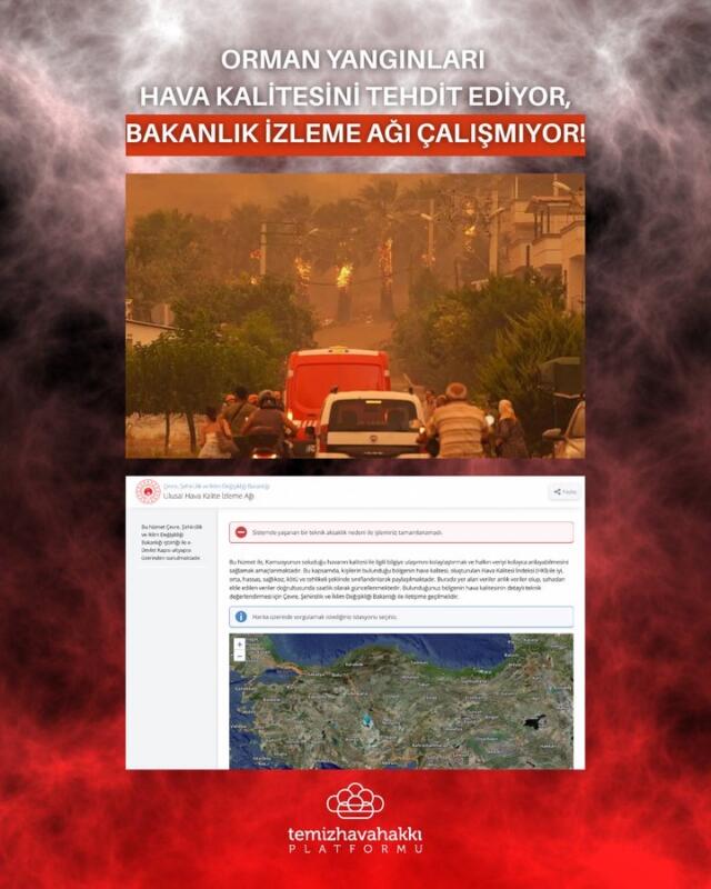 Temiz Hava Hakkı Platformu olarak, Çevre, Şehircilik ve İklim Değişikliği Bakanlığını derhal ülke genelinde hava kalitesi konusunda şeffaf veri paylaşımı yapmaya ve başta Sağlık Bakanlığı olmak üzere merkezi idareyi ve yerel yönetimleri yangın sezonu ile birlikte artacak hava kirliliği riskine karşı halk sağlığını koruyacak acil önlemleri almaya çağırıyoruz” denildi.