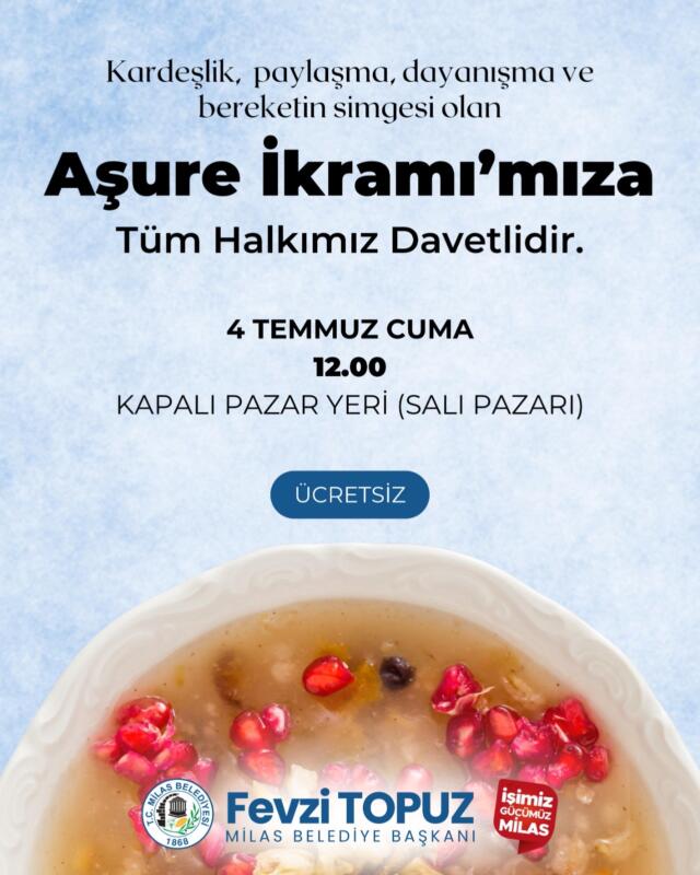Milas Belediye Başkanı Fevzi Topuz, Muharrem Ayı’nın birlik ve beraberliğin en güçlü simgelerinden biri olduğunu vurgulayarak, “Aşure ikramımızda tüm hemşehrilerimizi yanımızda görmekten mutluluk duyacağız. Gelin, paylaşmanın güzelliğini birlikte yaşayalım” ifadelerini kullandı.