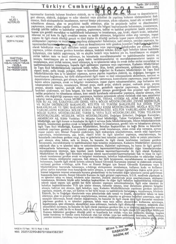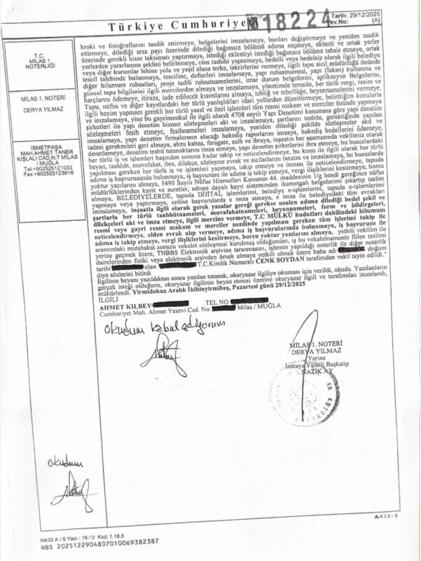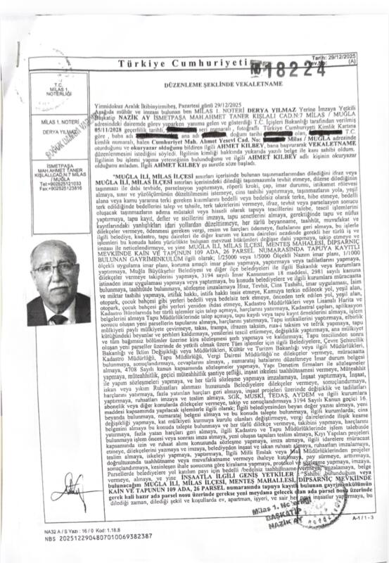 Kılbey açıklamasında; “29 Aralık 2025 tarihi itibarıyla” Milas 1. Noterliği’nde düzenlenen resmî vekâletname ve satış sözleşmeleri ile iddialara konu edilen taşınmaz ile tüm hukuki bağının sona erdiğine, arazi üzerindeki tüm tasarruf, kullanım ve işlem yetkilerini devrettiğine ve araziye dair herhangi bir işlem yapmasının hukuken mümkün olmadığına ve dolayısıyla, 29 Aralık 2025 sonrası gerçekleştiği iddia edilen herhangi bir kesim, işlem veya tasarrufun kendisiyle ilişkilendirilmesinin hukuki ve fiili gerçeklerle bağdaşmadığına dikkat çekti.