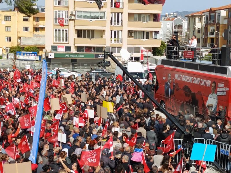 CHP Muğla Milletvekilleri Gizem Özcan, Süreyya Öneş Derici ve Cumhur Uzun’un da aralarında olduğu birçok CHP milletvekilinin, belediye başkanları ve meclis üyelerinin yanı sıra muhalefet partileri, sendikalar, sivil toplum örgütlerinin yönetici ve temsilcileriyle birlikte sekiz bine yakın sayıda katılımla gerçekleşen mitingde, cezaevindeki İstanbul Büyükşehir Belediye Başkanı ve CHP’nin Cumhurbaşkanı Adayı Ekrem İmamoğlu’nun mesajının CHP Muğla İl Başkanı Nail Kızıl tarafından okunmasının ardından CHP Genel Başkanı Özgür Özel, “Kurtuluş yok tek başına, ya hep beraber ya hiç birimiz”, “Havama, suyuma, toprağıma dokunma”, “Her yer Akbelen, her yer direniş”, “Hak, hukuk, adalet” sloganları ve alkışlar arasında konuşmasına başladı.
