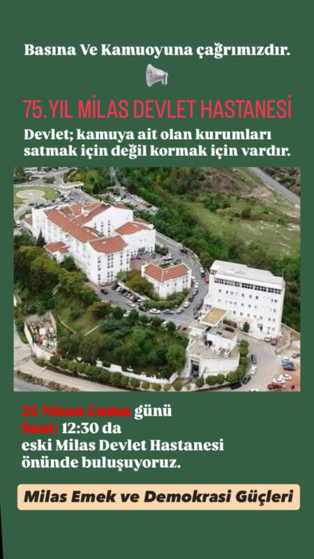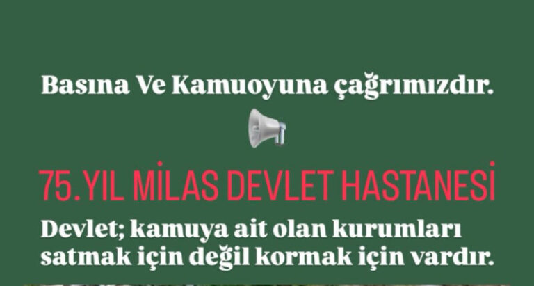 Milas eski Devlet Hastanesi önünde saat 12:30’da başlayacağı belirtilen buluşma çağrısında, “Devlet; kamuya ait olan kurumları satmak için değil korumak için vardır” denildi.